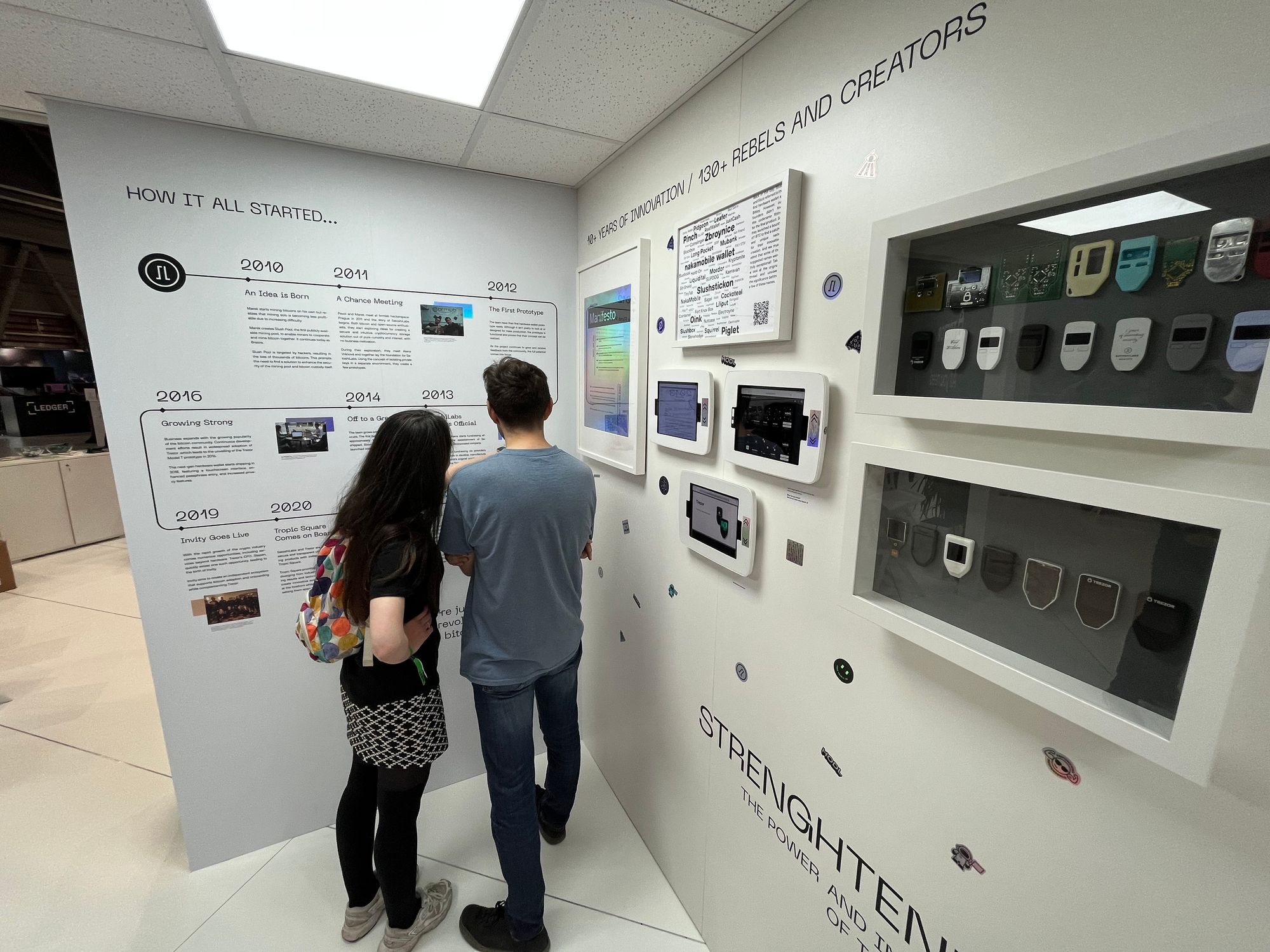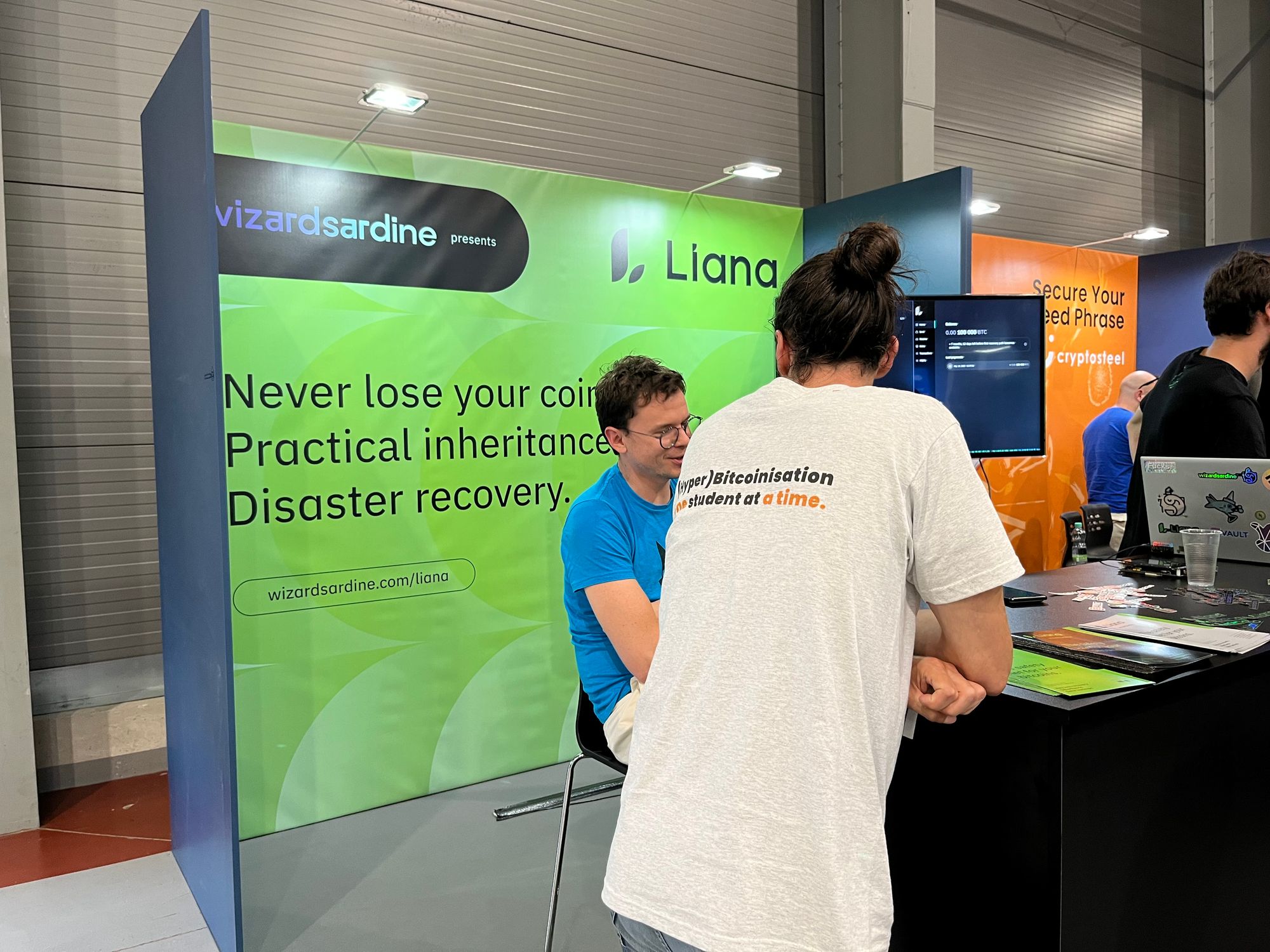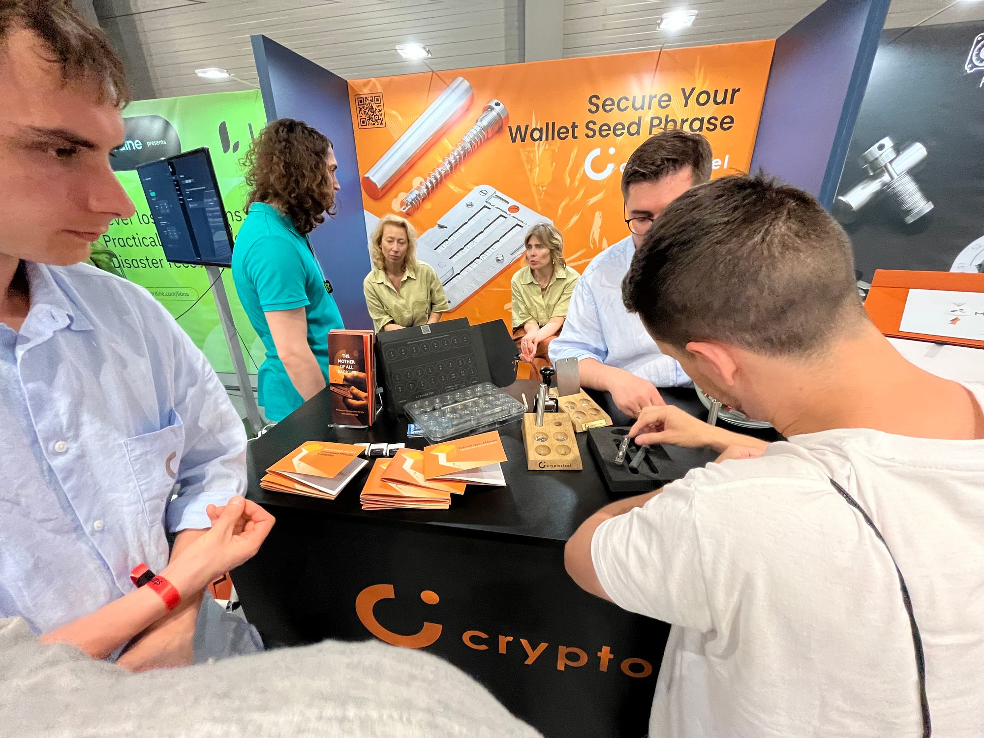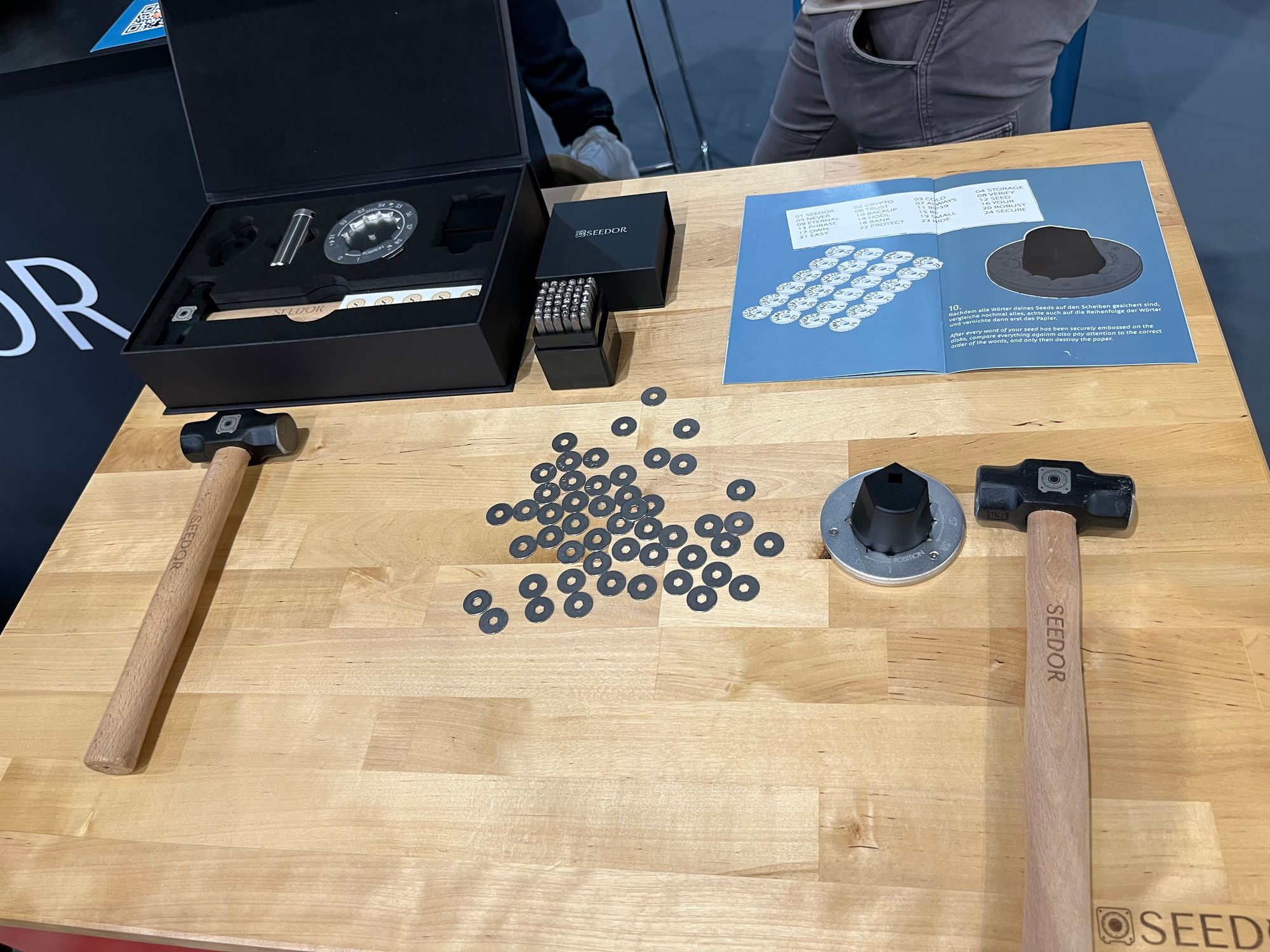 Taigi, šioje salėje turbūt daugiausiai buvo su BTC saugojimu susijusių vystytojų - abu didžiausi “piniginių” įrenginių gamintojai: Čekijos “Satoshi Labs” (“Trezor”) su turbūt didžiausiu ir vienu populiariausių stendu ir Prancūzijos “Ledger”, su mažyčiu ir beveik visą laiką tuščiu stendu. Taip pat buvo bent keletas kompanijų, siūlančių sprendimus, kaip apsaugoti savo BTC “seed” žodžius, arba pagrindinį kodą, leidžiantį pasiekti BTC. Be jau daugiau įprastų tokių sprendimų, pvz., rinkiniai, skirti pačiam metalo plokštelėse išsikalti tuos vertinguosius žodžius, buvo ir pora įdomesnių projektų.