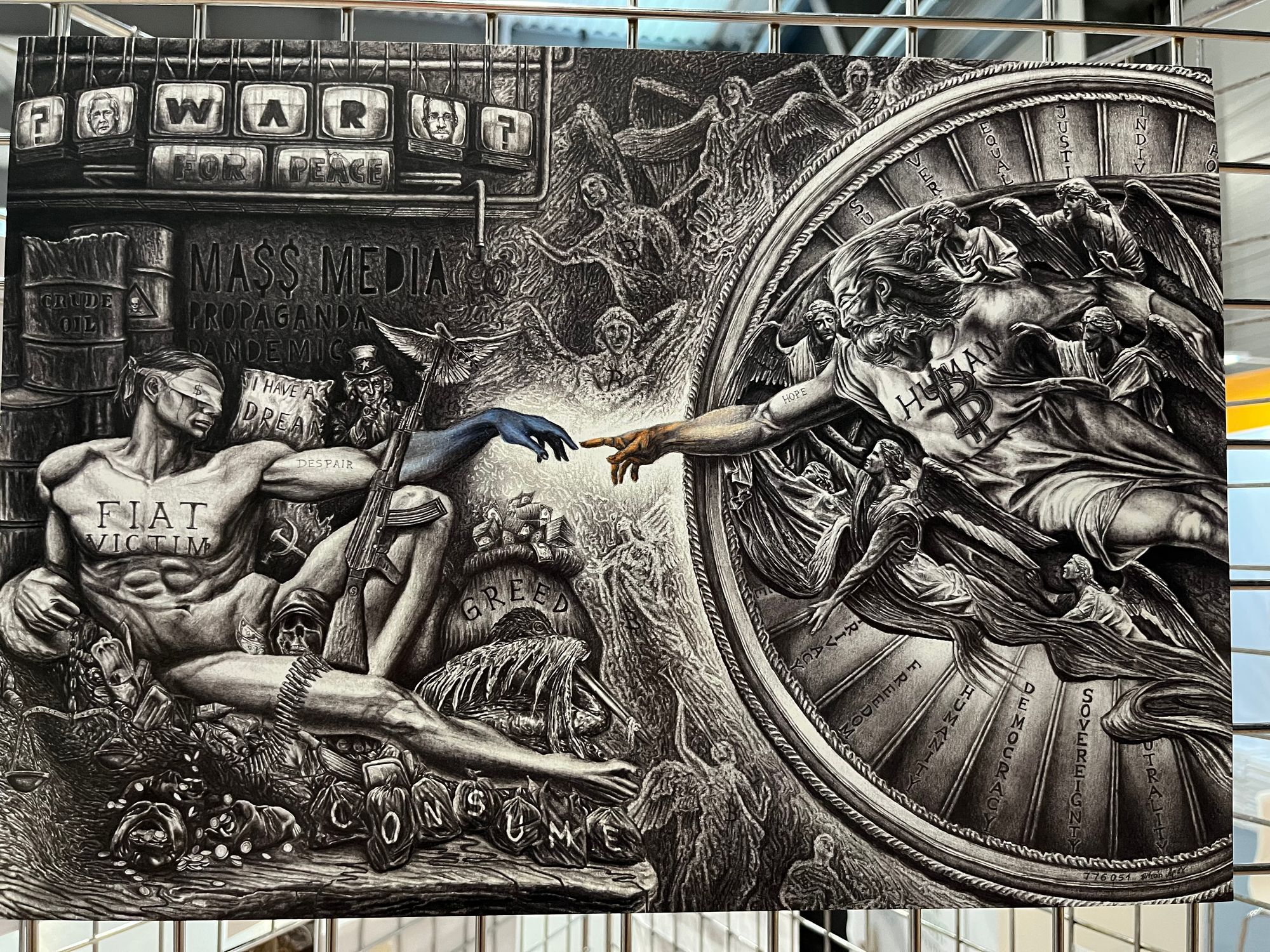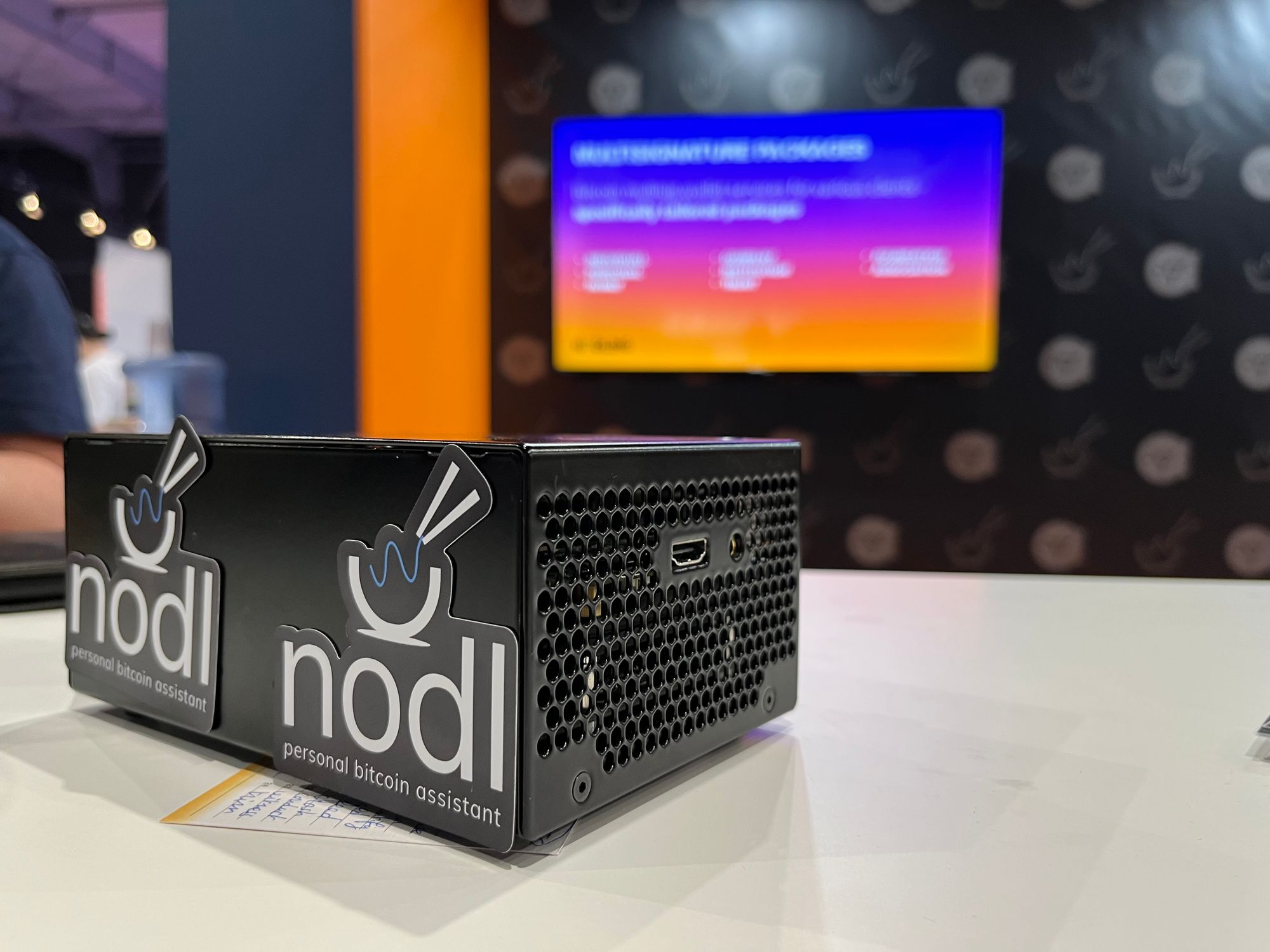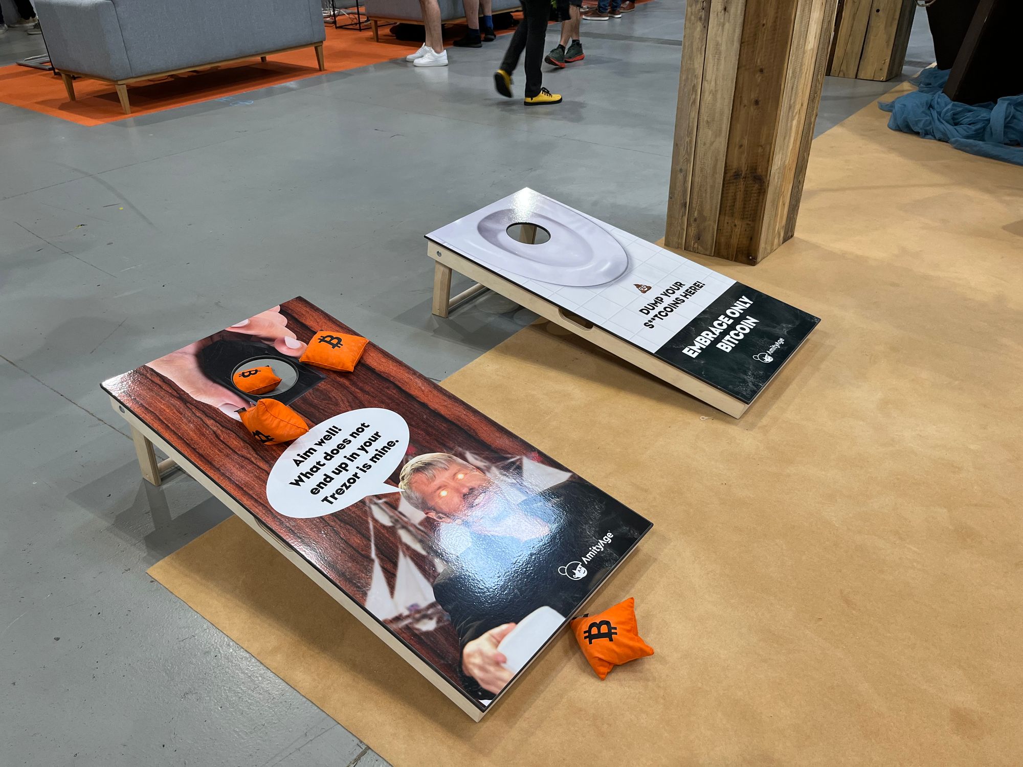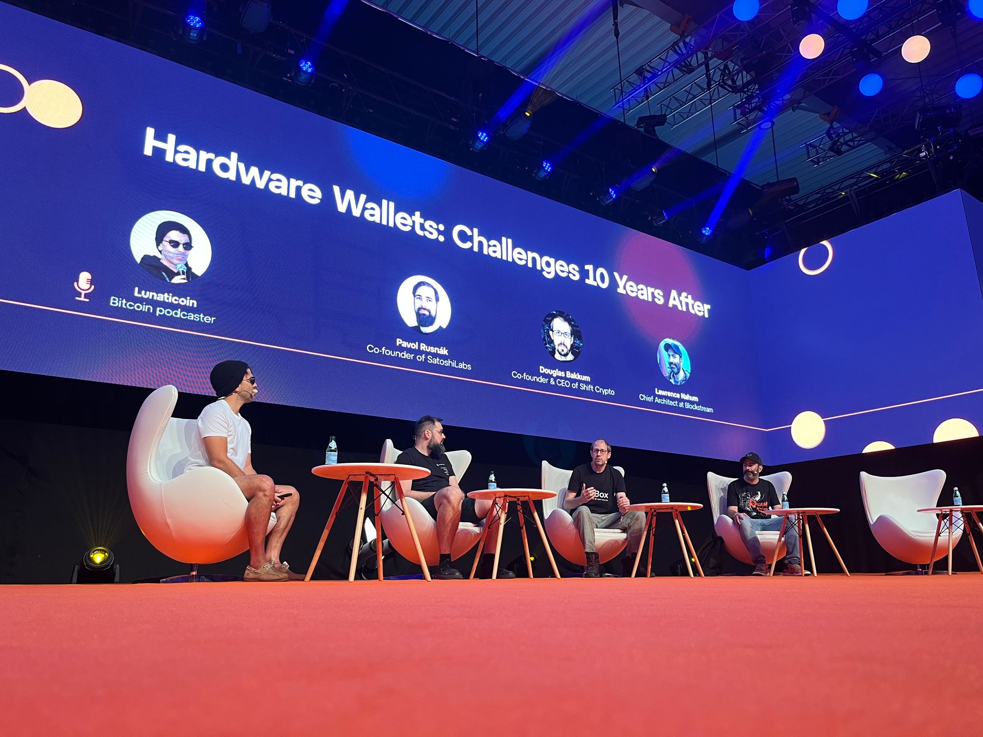 Taigi, šioje salėje turbūt daugiausiai buvo su BTC saugojimu susijusių vystytojų - abu didžiausi “piniginių” įrenginių gamintojai: Čekijos “Satoshi Labs” (“Trezor”) su turbūt didžiausiu ir vienu populiariausių stendu ir Prancūzijos “Ledger”, su mažyčiu ir beveik visą laiką tuščiu stendu. Taip pat buvo bent keletas kompanijų, siūlančių sprendimus, kaip apsaugoti savo BTC “seed” žodžius, arba pagrindinį kodą, leidžiantį pasiekti BTC. Be jau daugiau įprastų tokių sprendimų, pvz., rinkiniai, skirti pačiam metalo plokštelėse išsikalti tuos vertinguosius žodžius, buvo ir pora įdomesnių projektų.
