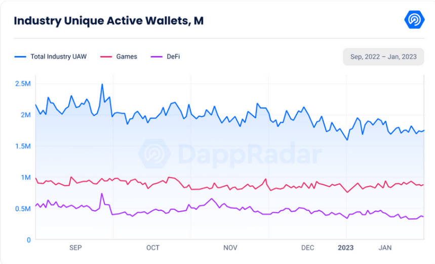 - Žaidimai sausį sudarė 48% blokčeinuose priskaičiuotų unikalių ir aktyvių "piniginių" - dienos vidurkis pasiekė 858 621 ir per mėnesį paaugo 1,3%, rodo "DappRadar" duomenys.