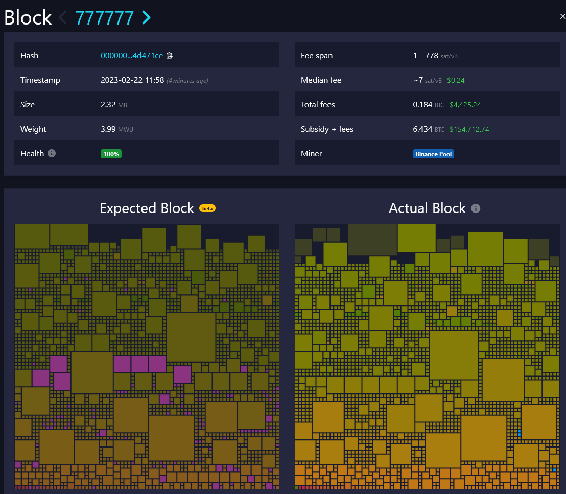 Šiandien yra 2023 m. vasario 22 d. ir 3635-a diena, kai Bitkoinas (BTC) veikia be sutrikimų 24/7. Be to, šis blokčeinas ką tik pasipildė 777 777-uoju bloku.