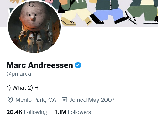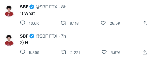 Taip, čia viskas. Bet to užteko, kad "visi" kalbėtų vien tik apie tai, bandydami atspėti, ką tai reiškia, prirašydami juokingiausių versijų (pvz., kad taip SBF sureagavo į žinią, ko negalės daryti kalėjime), spėliodami, kad čia SBF kažkam siunčia kažkokį kodą ir t.t. O štai milijardinio rizikos kapitalo fondo "Andreessen Horowitz" vienas įkūrėjų Marcas Andreessenas savo "Twitter" profilio aprašymą pakeitė į "1) What 2) H":