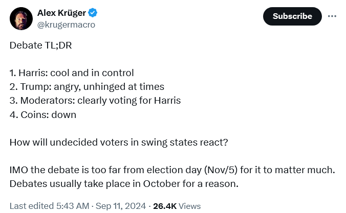 - Pirmieji debatai tarp kandidatų į JAV prezidentus Donald Trump ir Kamala Harris baigėsi be kriptoturto rinkos paminėjimų ir geriau vertinamais Kamala šansais laimėti (nors kova vis dar apylygė). Tad akcijų ir BTC rinkos dabar bando tai suvirškinti kiek smuktelėdamos.