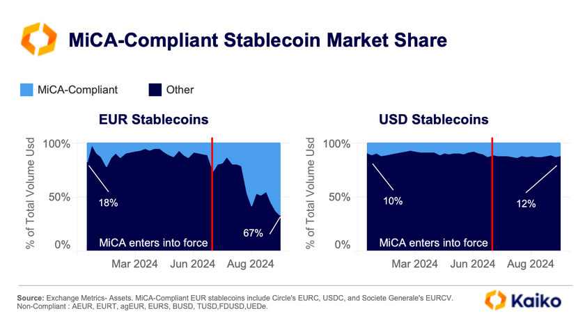 - "Kaiko" analitikai paskaičiavo, kad ES kripto reglamentas MiCA taip pakeitė europinę steiblkoinų rinką: