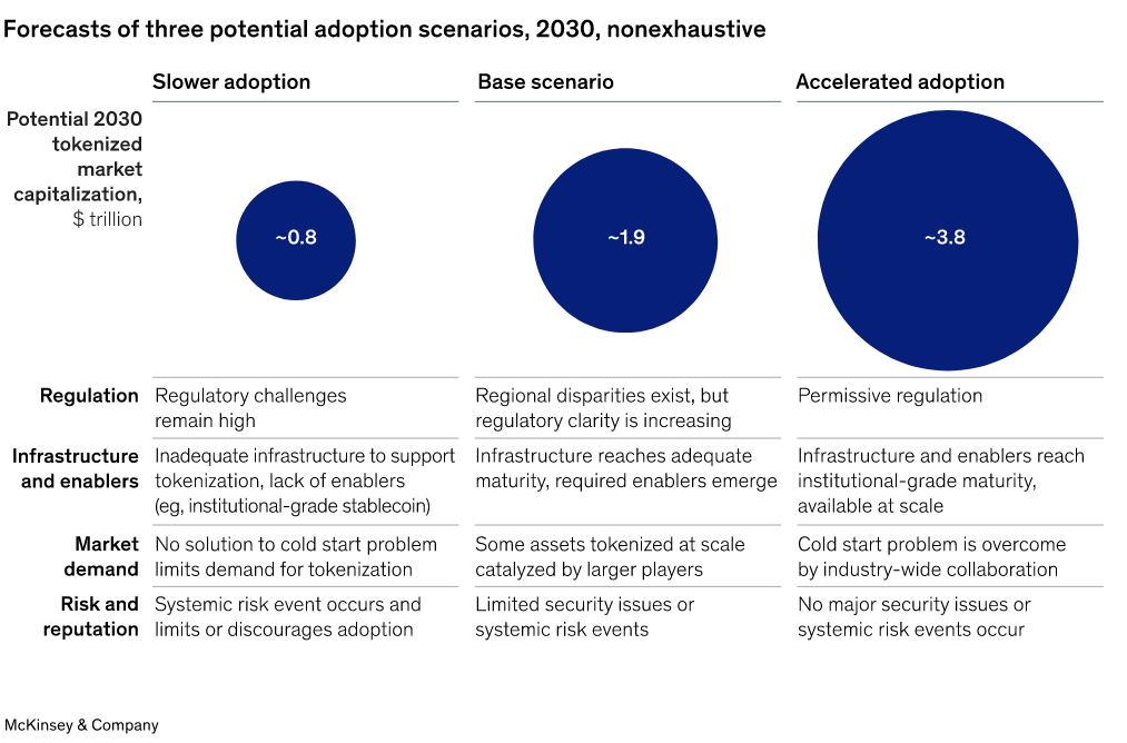 - "McKinsey" analitikai paskelbė tokias žetonizacijos rinkos augimo prognozes (atrodo gerokai pasimistiškesnės nei kitų analitikų lūkesčiai):