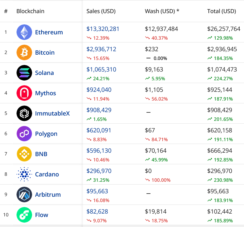 - Bitkoino blokčeine įkelti NFT per keletą mėnesių pagal prekybos apyvartą aplenkė visus blokčeinus, išskyrus Ethereum (ETH).