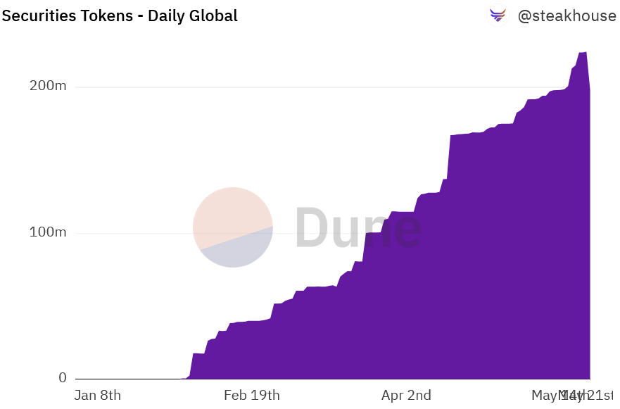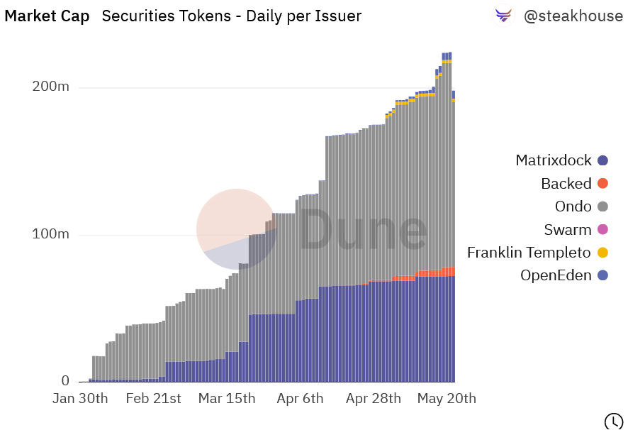 - Žetonizuotų (tokenized) vertybinių popierių rinka gegužę perkopė bent USD 200 mln. (duomenys lyg ir ne iš visų blokčeinų). Toks suskaitmeninimas palengvina prekybą šiais popieriais.
