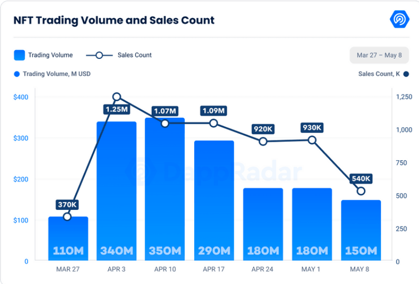 - NFT prekybos mėnesinė apyvarta šį mėnesį gali būti pirmą kartą šiemet mažesnė nei USD 1 mlrd., skaičiuoja "DappRadar".