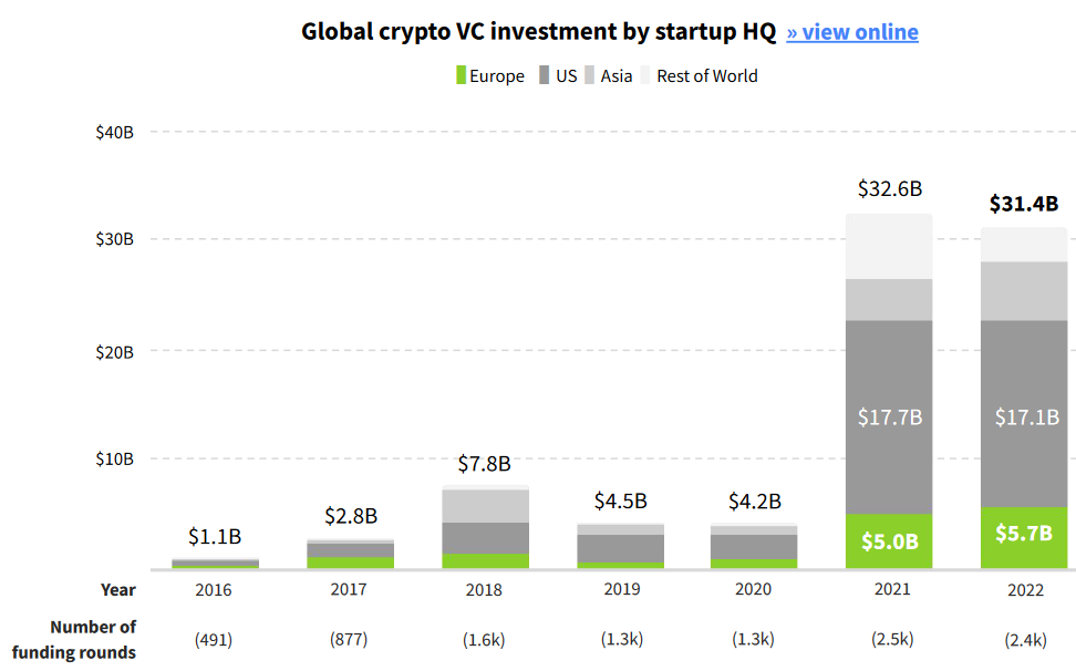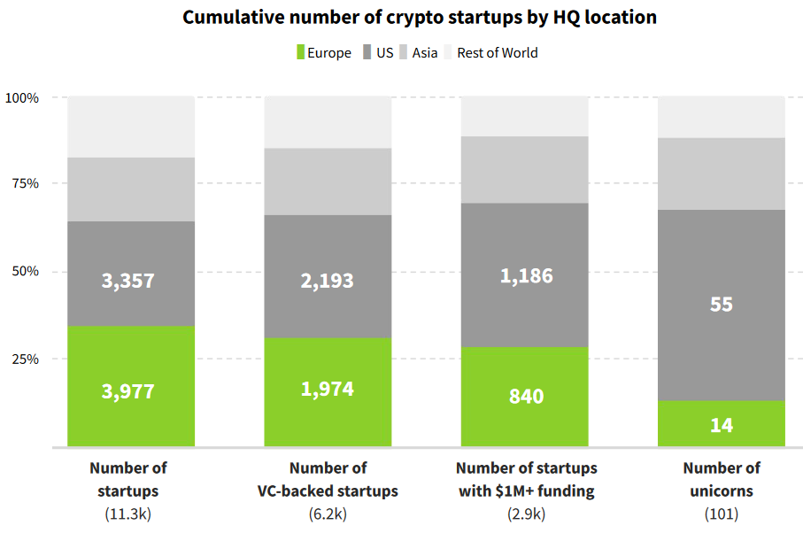 - Kripto startuoliai Europoje pernai pritraukė rekordinę sumą rizikos kapitalo investicijų, rodo "Rockaway" ir "Dealroom.co" duomenys. Europoje taip pat priskaičiuojama daugiausiai tokių startuolių, tačiau, bėgant laikui, jų dalis mažėja, o JAV išlieka didžiausia kripto "vienaragių" "ganykla".