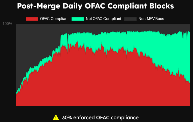- Ethereum (ETH) blokčeine cenzūruojamų blokų dalis pirmą kartą nuo pernai rugsėjo nukrito iki 30%. Situacija gerėja aktyviau veikiant ETH blokų perdavėjams (relėms, relay), kurie ignoruoja JAV reguliuotojų pritaikytas sankcijas "Tornado Cash" mikseriui. (Kiek detaliau apie tai rašiau čia.)