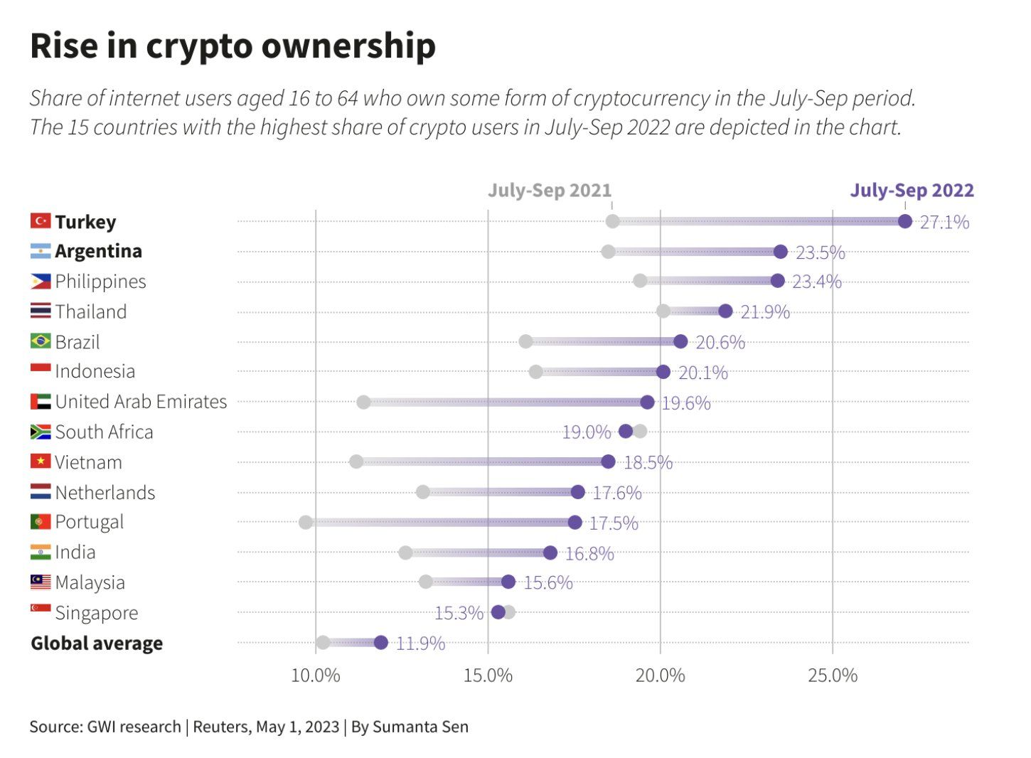 - Tyrimų bendrovės GWI duomenys rodo, kad beveik visose tirtose šalyse BTC ir kripto savininkų padaugėjo.
