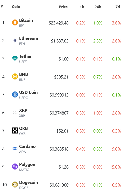 Po šeštadienį buvusio smuktelėjimo žemiau USD 23 000 ribos, BTC kaina šiek tiek atsigavo ir pastaruoju metu blaškosi tarp USD 23 700 ir USD 23 300. Panašia trajektorija juda ir ETH.