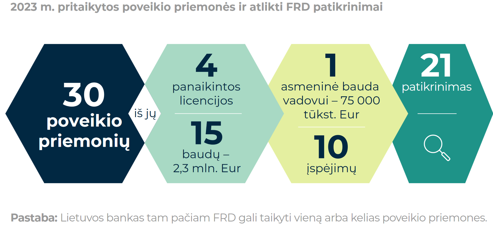 - Lietuvos bankas paskelbė ataskaitą apie finansų sektoriaus pinigų plovimo ir teroristų finansavimo prevencijos priežiūrą. Rinkos dalyviai skaičiuoja, kad daugėjo patikrinimų (+5%), perspėjimų (+67%), atimtų licencijų (+100%), baudų (+275%, o jų dydis augo +308%) ir veiklos apribojimų (+25%). Konkretūs sektoriai ataskaitoje neišskirti.