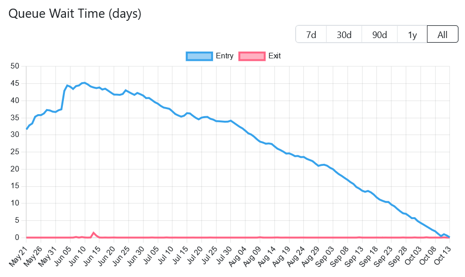 - Dar vienas ženklas bent jau dabartiniame etape sumenkusio susidomėjimo Ethereum (ETH) - iš esmės dingo eilė vadinamųjų steikerių, laukiančių, kol galės šiame blokčeine už palūkanas (šiuo metu sumažėjusios iki beveik 3%) įdarbinti (stake) savo ETH, tapdami ETH operacijas prižiūrinčiais tvirtintojais (validators) (tam reikia turėti bent ETH 32 (USD 49 000), nors mažesnes sumas galima steikinti ir per tam tikras platformas). Birželio pabaigoje buvusioje eilėje būtų tekę laukti 45 dienas.