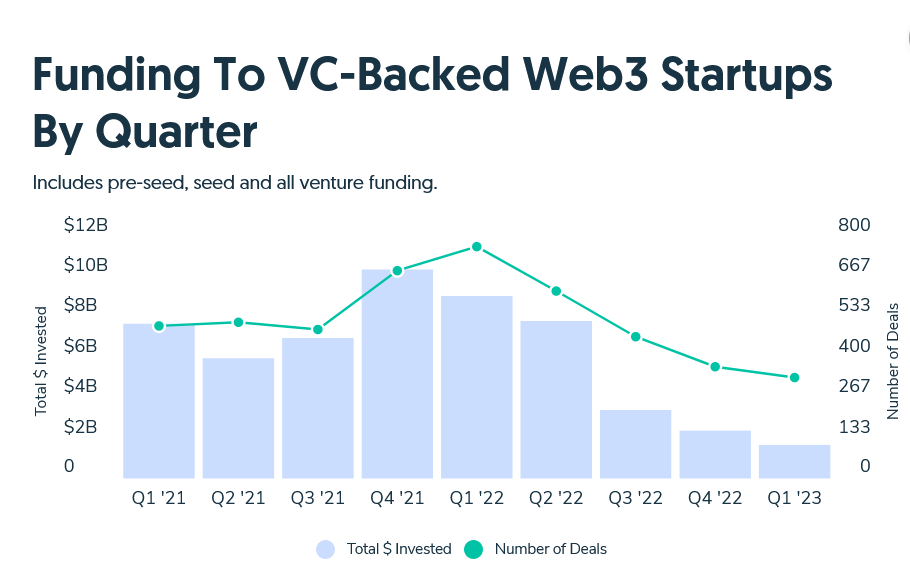 - "Web3" startuoliai (įvardinami kaip kriptovaliutų ir blokčeino projektai) šiemet pirmą ketvirtį sulaukė USD 1,7 mlrd. rizikos kapitalo investicijų, arba 82% mažiau nei pernai tuo pat metu, rodo "Crunchbase" duomenys. Sandorių skaičius sumažėjo trečdaliu, iki 333.