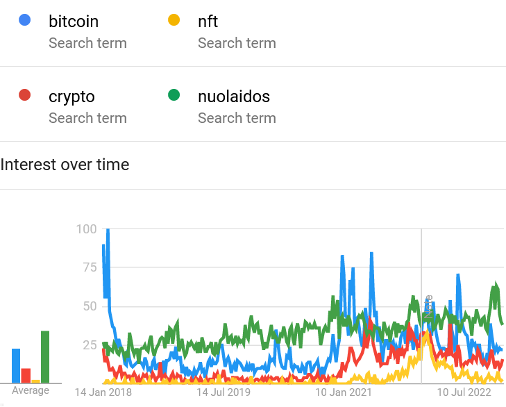 Tuo pačiu, jei palyginsi lietuviškas “gūglinimo” tendencijas, jos labiau atitinka kainų svyravimus. Tačiau, nepaisant to, kad BTC ir kripto dabar yra jau geriau atpažįstami nei prieš keletą metų, “bitcoin” ir “crypto” raktažodžių šios meškų rinkos metu vistiek ieškoma žymiai daugiau nei 2018-2020 m. “meškyne”. (Palyginimui, įdėjau ir turbūt labiau aktualų žodį “nuolaidos”.)