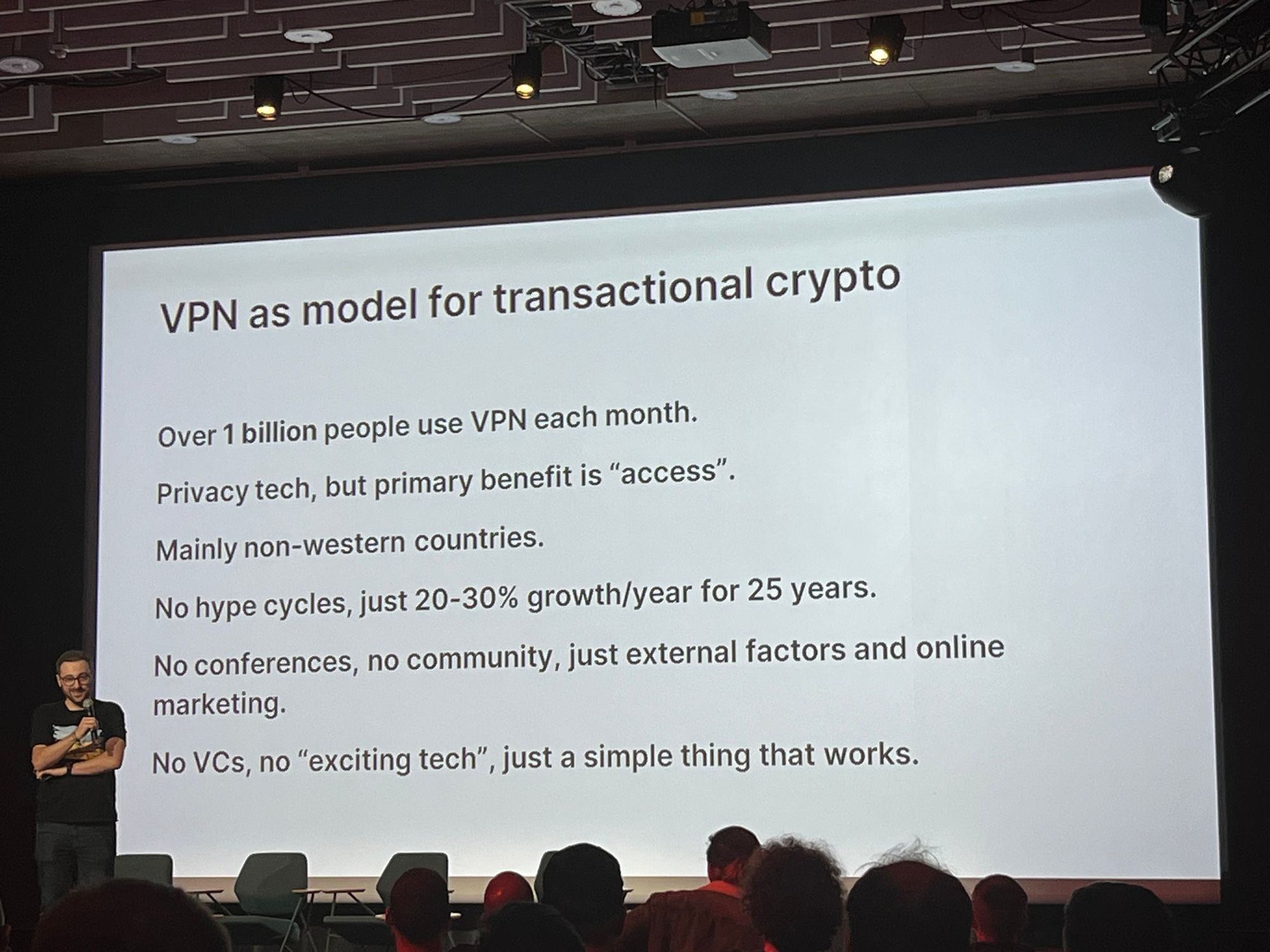 Vieną iš netikėčiausių ir įdomių prezentacijų surengė jutūberis ir rašytojas Ionis Appelbergas - bendrosios praktikos gydytojas, pats su savimi bandantis psichodelines medžiagas, kaip kad pastaruoju metu daug dėmesio sulaukiantis psilocibinas. Kaip sako Ionis, jei tokios medžiagos pakeičia smegenų operacinę sistemą, sukuria daugiau jungčių smegenyse, tai Bitkoinas pasaulyje sukuria daug daugiau naujų ekonominių jungčių.