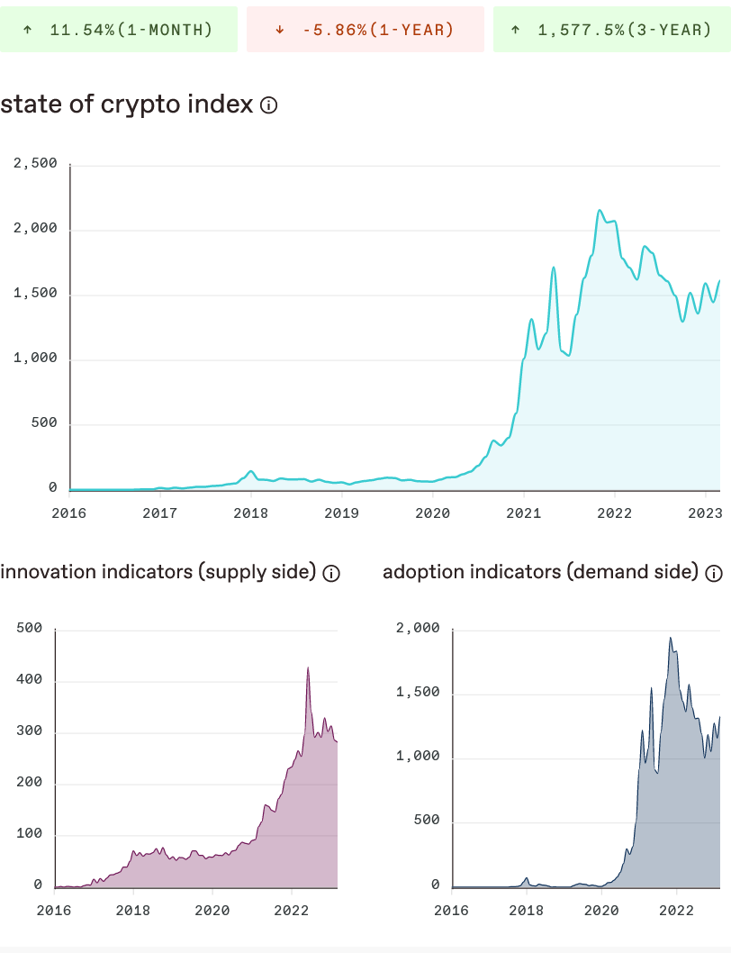 - Rizikos kapitalo milžinė "a16z" sukūrė naują kripto industrijos indeksą, įvertinantį su šio sektoriaus vystymu (pvz., vystytojų, išmaniųjų kontraktų skaičius, darbo skelbimai ir t.t.) ir paklausa (pvz., kripto adresai, operacijų skaičius, steiblkoinų apyvarta ir t.t.) susijusius rodiklius. Pagal indeksą - reikalai yra šiek tiek prastesni nei prieš metus, bet geresni nei prieš trejus. Bendrovė taip pat paskelbė savo naujausią ataskaitą apie Web3 reikalus. Ta proga galima prisiminti vieno iš "a16z" vadų, Marco Andreesseno, nelabai pavykusius bandymus paaiškinti, ką su tuo Web3 realiai galima nuveikti. Bet gal dabar jau aiškiau.