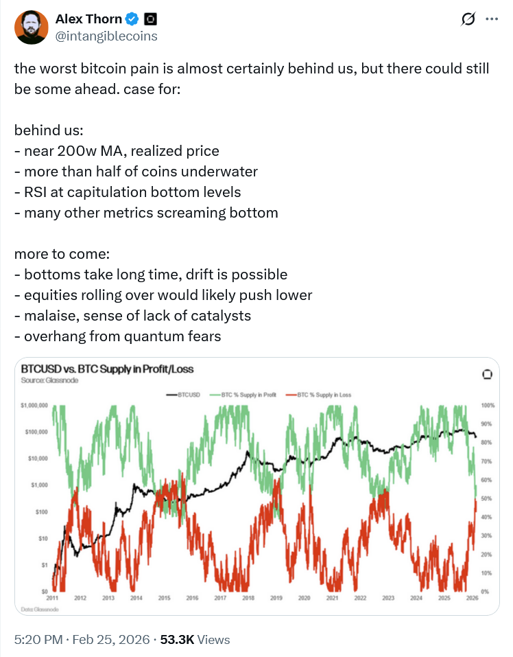 - Žodžiu, kaip apibendrina populiarus bitkoino analitikas James Check, tikėtina, kad sudėtingiausias šio rinkos nuosmukio etapas jau praėjo (su tuo sutinka ir "Galaxy Digital" tyrimų vadovas Alex Thorn), tačiau niekas nežino, kiek reikės laukti atsigavimo. Anot James, jei turite tvirtą ir aiškią investicinę tezę, kodėl bitkoinas ilgu laikotarpiu gali brangti, nereikia dabar bandyti gaudyti kainos dugno, nes tai yra paprasčiausia loterija, o geriau tiesiog periodiškai pamažu apsipirkinėti ir ignoruoti "ambicijų neturinčias meškas".