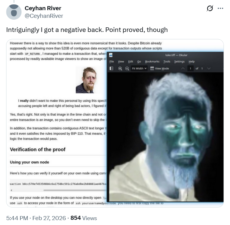 - Be to, kol socialiniuose tinkluose matomoje Bitkoino bendruomenėje toliau vyksta mūšiai dėl to, ar leisti šiame blokčeine įrašinėti ne finansines operacijas, pvz., įkelti paveiksliukus, vienas vystytojas dar kartą įrodė, kad tokie bandymai drausti yra neveiksmingi. Slovakas Martin Habovštiak į Bitkoino blokčeiną įkėlė už tokius draudimus pasisakančio vystytojo Luke Dashjr nuotrauką, kurioje jis neva verkia.