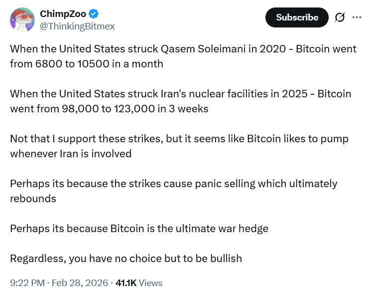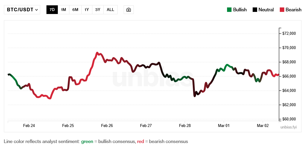 Turim dar vieną naują-seną, su Iranu susijusią geopolitinę krizę, ir standartines rinkų reakcijas. Po savaitgalį buvusių atakų bitkoinas ir vėl tapo pagrindine priemone investuotojams reaguoti į naujienas kol tradicinės rinkos uždarytos. Po naujienų panikuotojai vėl pardavė bitkoiną, jo kaina nukrito žemiau USD 64 000, tačiau netrukus grįžo iki USD 68 000, arba netgi aukščiau nei prieš atakas. Nuo tada ralis aprimo ir kaina pastarosiomis valandomis bando laikytis ties USD 65 000. Aktyvumas rinkoje per savaitę iš esmės nepasikeitęs ir apyvartos yra tik nežymiai didesnės nei praėjusį pirmadienį. Jei kartotųsi istoriniai scenarijai, tokie geopolitiniai išsipardavimai greitai baigiasi ir kainos atšoka.
