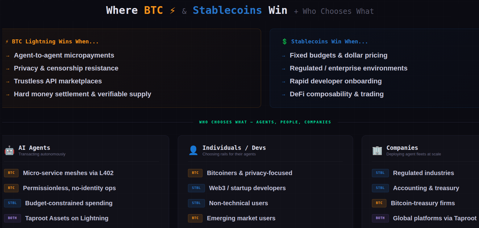 - Tuo metu bitkoineriai toliau tvirtina, kad bitkoinas AI agentų ekonomikoje prieš kripto ir steiblkoinus laimi ne tik tokiais techniniais parametrais kaip greitis ir pigumas, bet ir savo neutralumu, decentralizuotumu ir nepriklausymu nuo trečiųjų šalių įgeidžių, pvz., užšaldyti tąvo sąskaitas. Pastarosios savybės gali tapti itin aktualios toliau gilėjant pasaulio finansinėms, geopolotinėms, socialinėms problemoms. Tuo pačiu, Bitkoino vystytojas Matt Corallo primena, kad AI agentų ekonomikoje daugiau naudojant bitkoiną galima sumažinti riziką, kad ši rinka bus monopolizuota korporacijų.