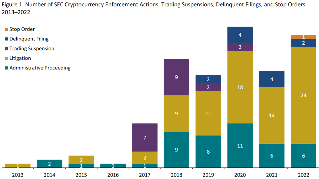 - Savo ruožtu "Cornerstone Research" skaičiuoja, kad pernai SEC inicijavo 30 teisinių ginčų/administracinių priemonių prieš kripto projektus, arba 50% daugiau nei užpernai. Beveik pusė šių atvejų buvo susiję ICO (initial coin offering).