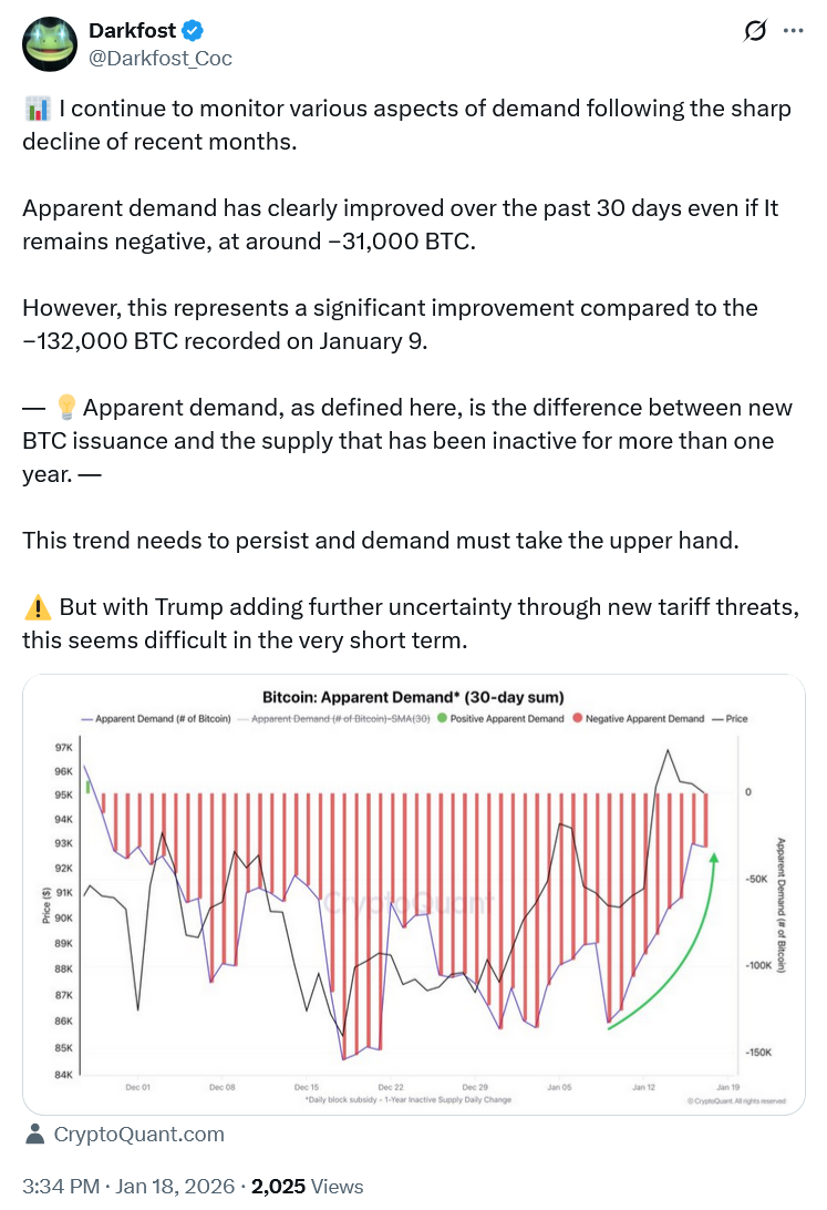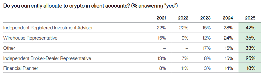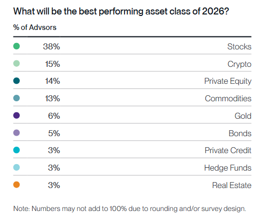 - Naujausia "Bitwise" atlikta finansų patarėjų apklausa rodo, kad, nepaisant prastais vadinamų 2025 m., patarėjai toliau didino BTC ir kripto portfelius, tai žadama daryti ir toliau, nors, bent jau apklausos metu, buvo manoma, kad akcijų rinkos šiemet pasirodys geriau nei kriptoturtas. (Naujausios institucinių investuotojų ataskaitos taip pat rodo, kad šie BTC portfeliai paskutinį ketvirtį pernai didėjo).