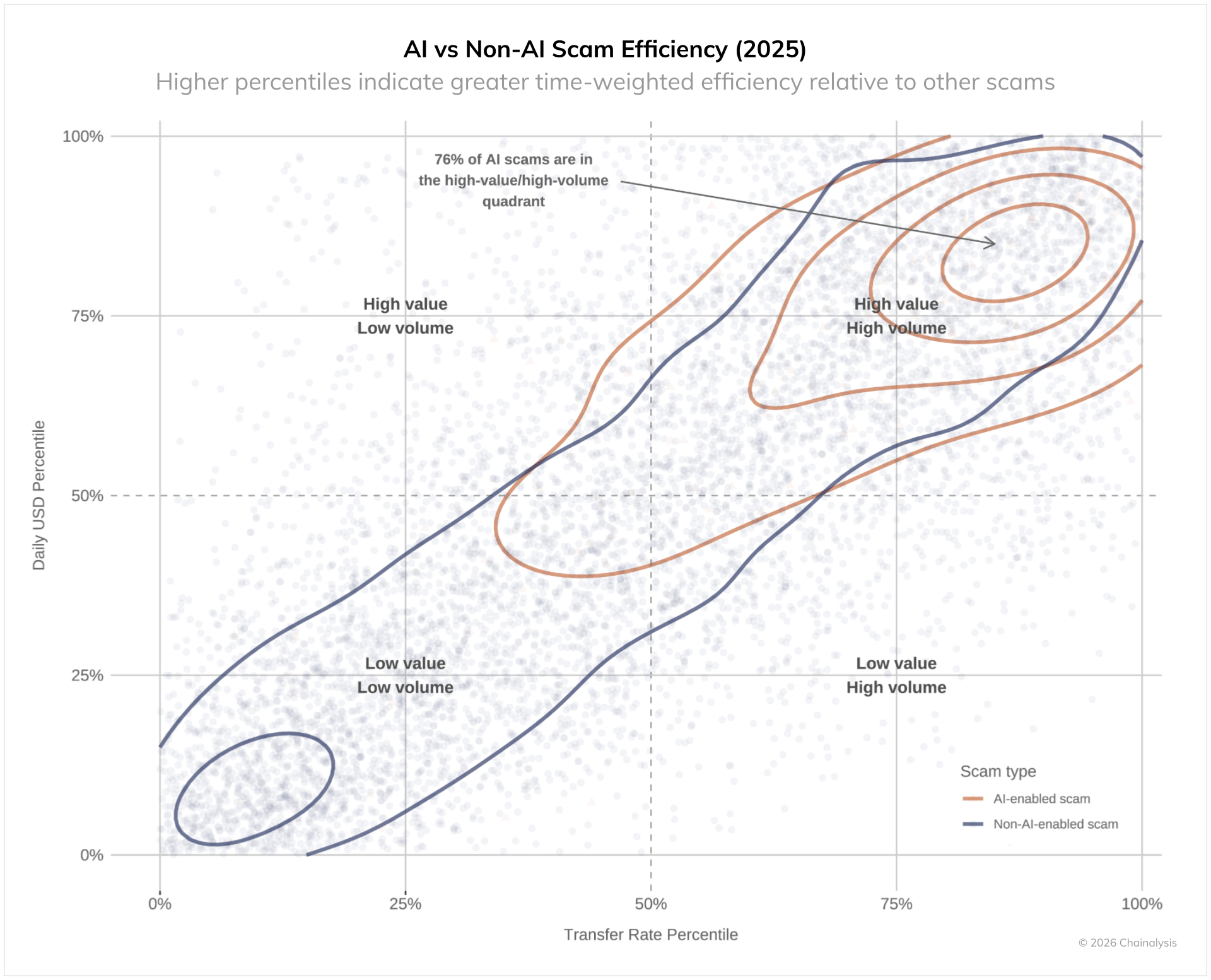 - "Chainalysis" duomenimis, pernai sukčiai pavogė USD 17 mlrd. vertės kriptoturto, ypač stipriai augo apsimetinėjimo tikromis organizacijomis, AI naudojimo atvejų. Beje, AI, panašu, stipriai prisidėjo prie tokios "veiklos efektyvumo".