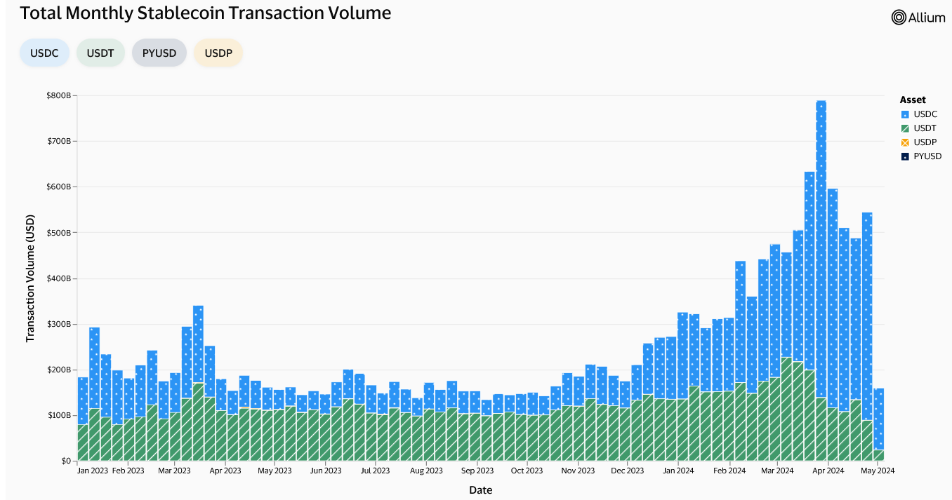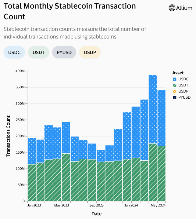 - "Visa" skaičiuoja, kad, naudojant jos metodologiją, skirtą atsijoti prekybines programas ("botus"), USD coin (USDC) steiblkoinas pagal mėnesinę operacijų vertę ir operacijų skaičių aplenkė tether (USDT). Duomenys atrodo įdomiai turint omeny, kad USDT rinkos kapitalizacija (USD 111 mlrd), yra daugiau nei triskart didesnė nei USDC. Tuo metu "Nansen" analitikai skaičiuoja, kad USDT, USDC ir DAI steiblkoinų bendra apyvarta per pastarąjį mėnesį buvo didesnė nei "Visa" apdorotų operacijų vertės vidurkis 2023 m. Šiuos visus duomenis galima palyginti ir su "Kaiko" analitikų pateikiamais skaičiais.
