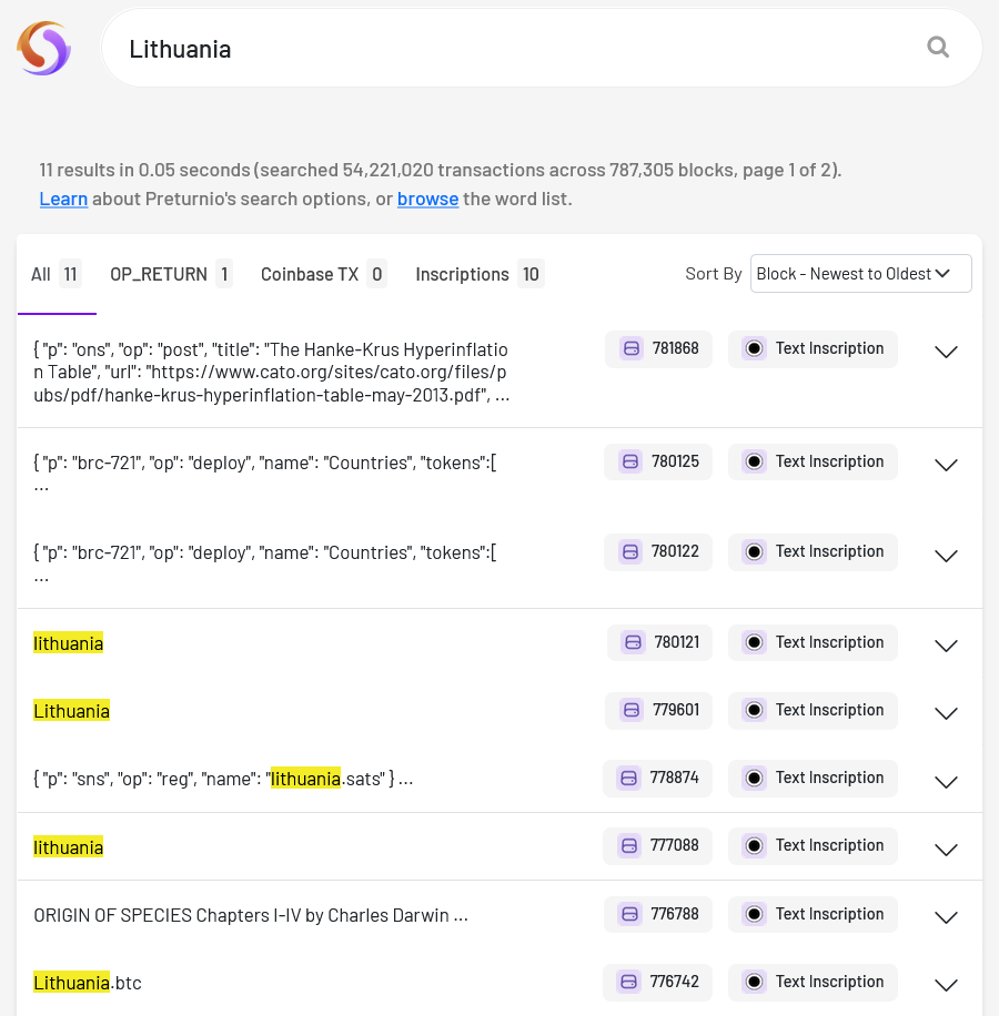 - Nuo šiol galima lengviau naršyti Bitkoino blokčeiną ieškant čia įrašytų tekstų. Ačiū "Preturnio"! Pavyko rasti štai tokius įrašytus Ordinals, arba NFT ant Bitkoino: