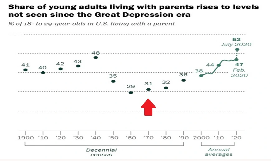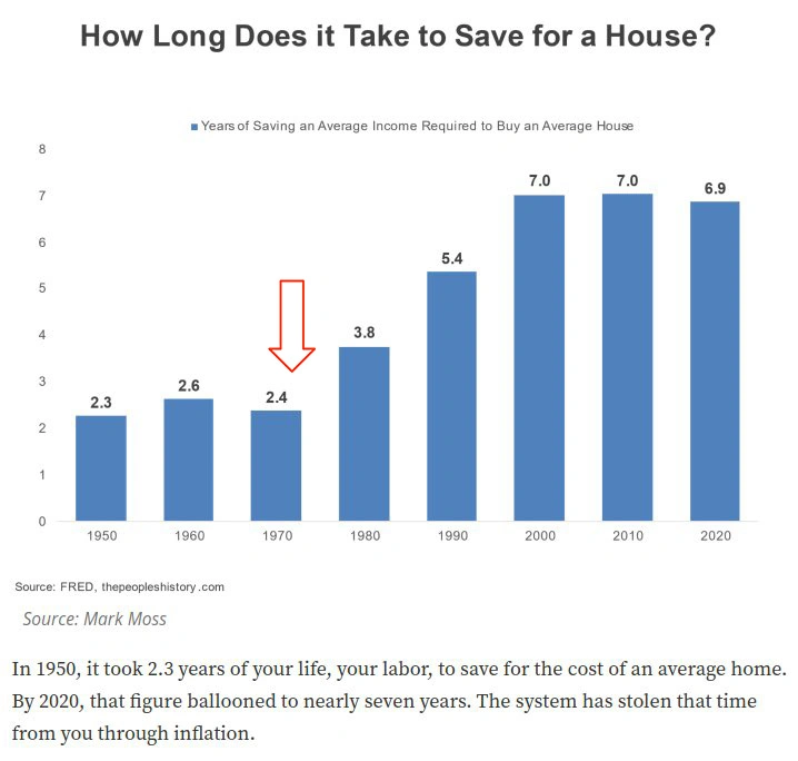 Kita vertus, yra ir toks grafikas apie galimybes JAV sutaupyti namui iki begalybinių pinigų sistemos atsiradimo ir po: